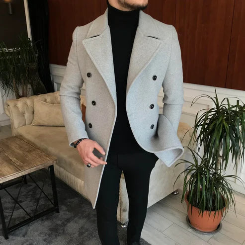 The carefully refined slim fit design slips perfectly over a jacket but sits close enough to the body to suit a simple shirt and a layered piece of knitwear. The coat is finished with a commanding double-breasted fastening and comes in a practical length cut.